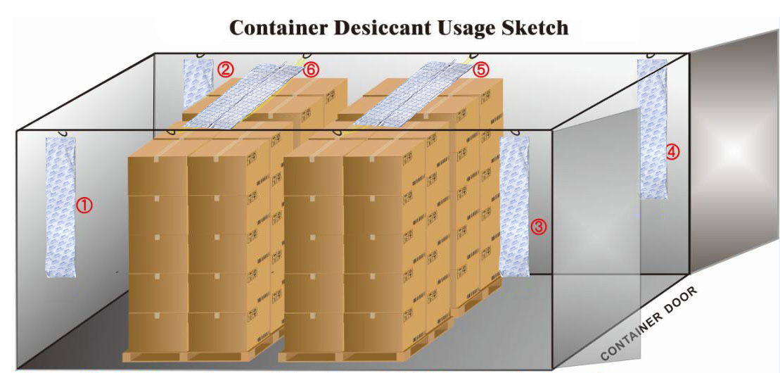 For most cargoes, 4-6 pieces of Superior Container Desiccant H1000/L1000 are required in a 20 ft container. (8-12 pieces of Superior Container Desiccant H1000/L1000 are required in a 40ft container). Strings to fasten Dry Covers are sent together to you